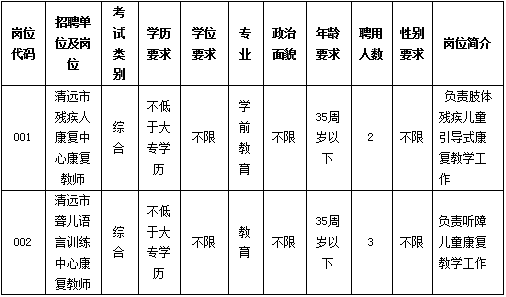 清遠(yuǎn)市殘疾人康復(fù)中心、清遠(yuǎn)市聾兒語(yǔ)言訓(xùn)練中心,是市殘聯(lián)直屬公益一類事業(yè)單位,是專門(mén)為0-6歲殘障兒童康復(fù)的機(jī)構(gòu)。根據(jù)工作需要招聘康復(fù)教師5名(屬非編制人員,不列入用人單位編制序列,不擔(dān)任行政職務(wù)),現(xiàn)將有關(guān)事項(xiàng)公告如下: