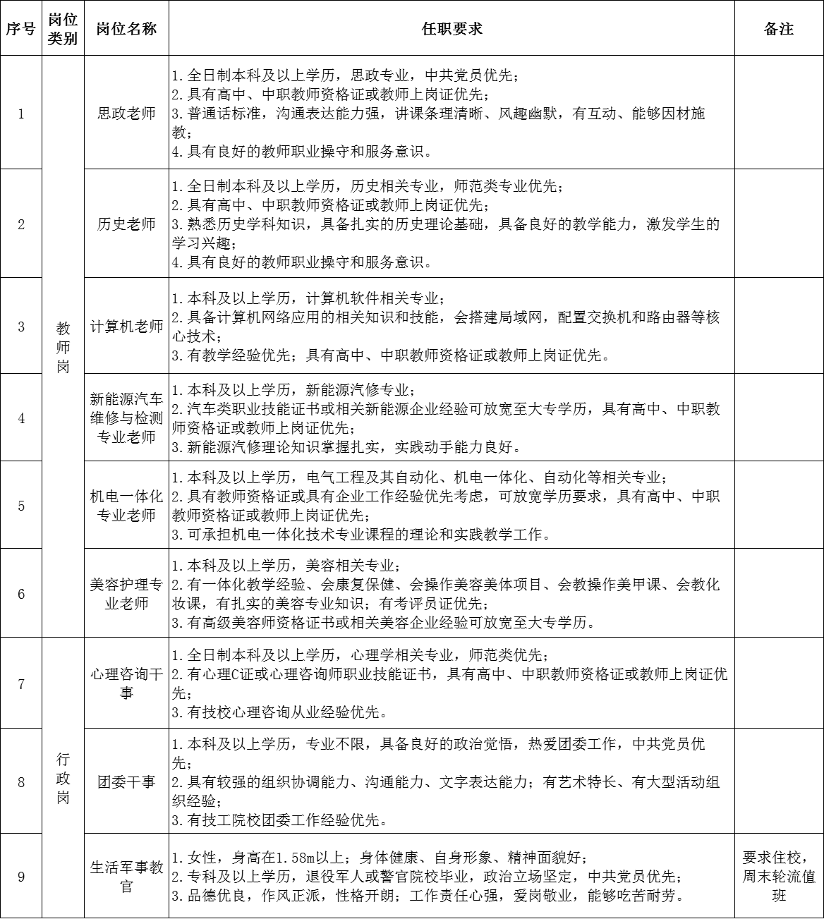 4、教師崗需本科及以上學(xué)歷,碩士優(yōu)先;文化課教師需持有相應(yīng)的教資;專業(yè)課教師持有相應(yīng)技能證書/職稱或相應(yīng)行業(yè)經(jīng)驗(yàn)優(yōu)先錄用。