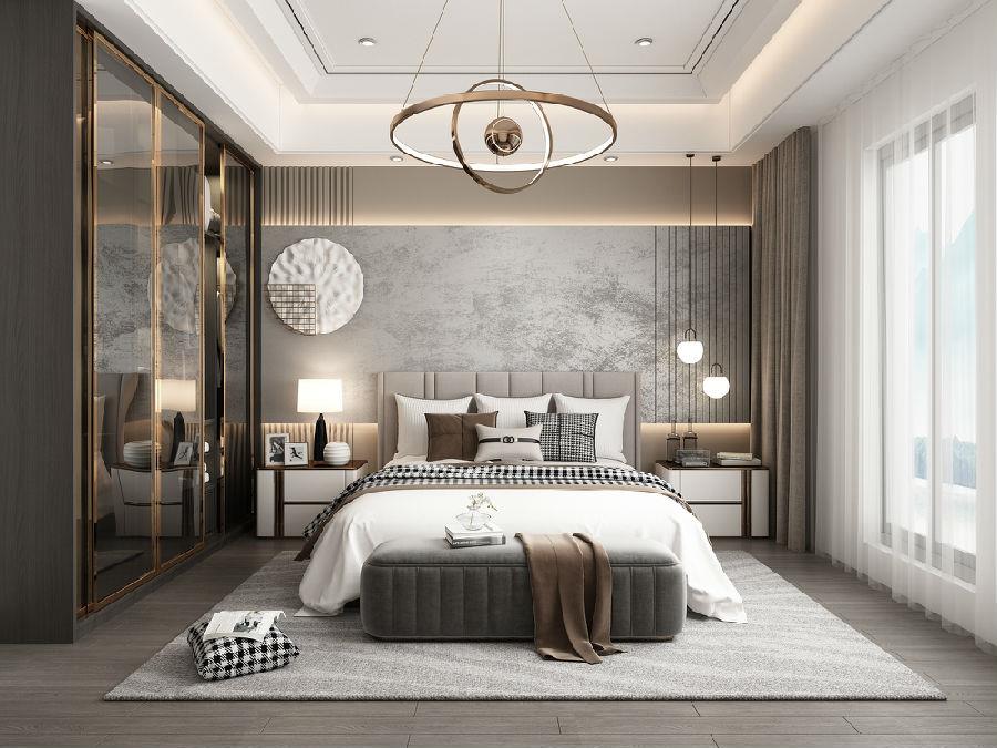 我們這款熱裝樓盤主要是針對(duì)我們主臥室的設(shè)計(jì),由圖可見(jiàn),臥室整體顏色以灰色為主,顯得非常的高雅大氣,顏色也不是很雜,給人一眼望去就很清爽、高貴的體感。地磚和墻磚,整體線條一看就沒(méi)有瑕疵,整齊、美觀。